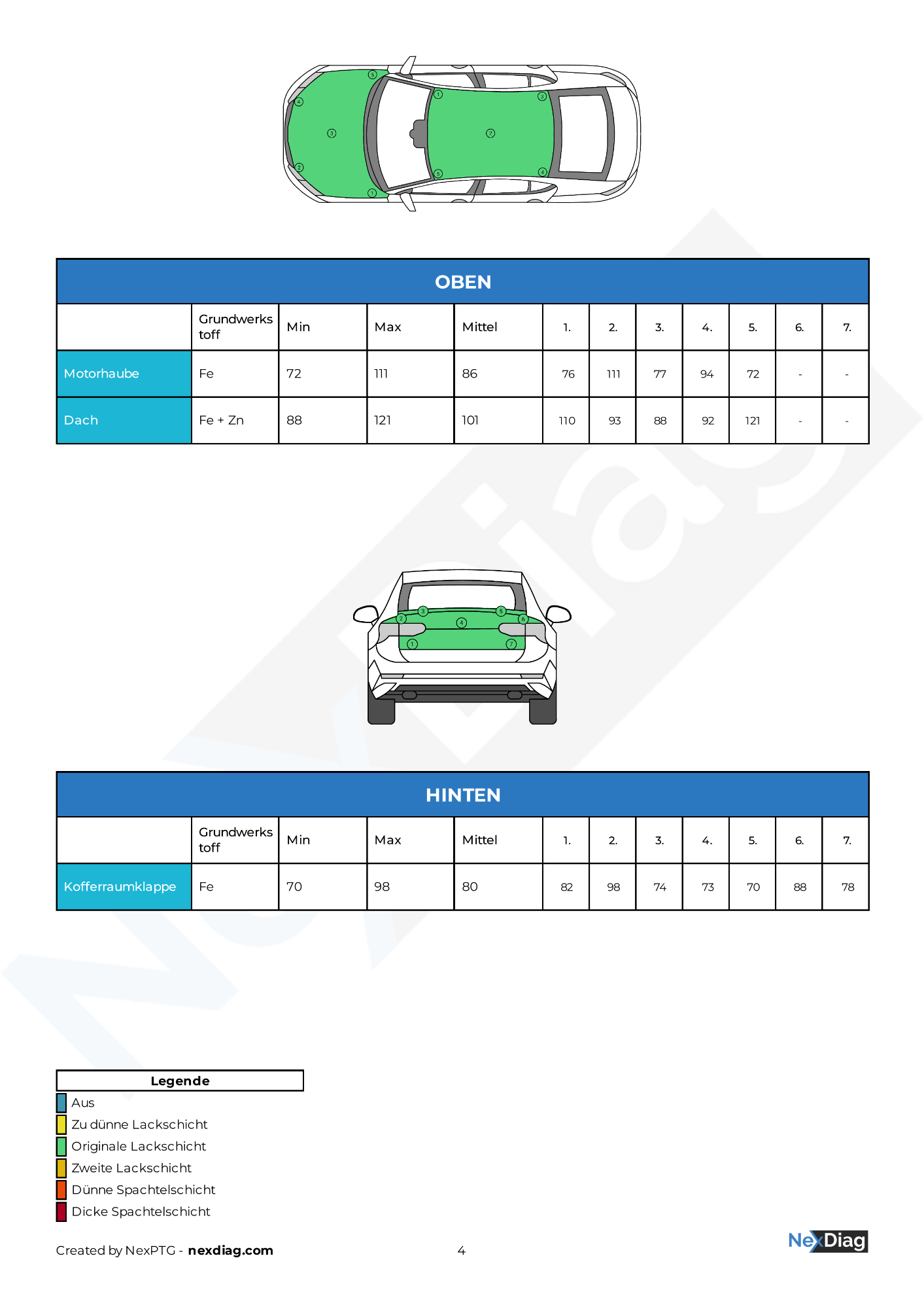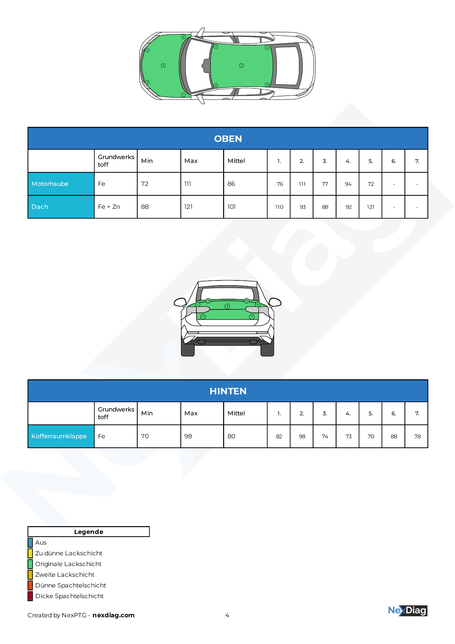 Er enthält die Messergebnisse sämtlicher relevanter Karosserieteile und gibt Aufschluss darüber, ob es Hinweise auf Nachlackierungen oder Reparaturen gibt.